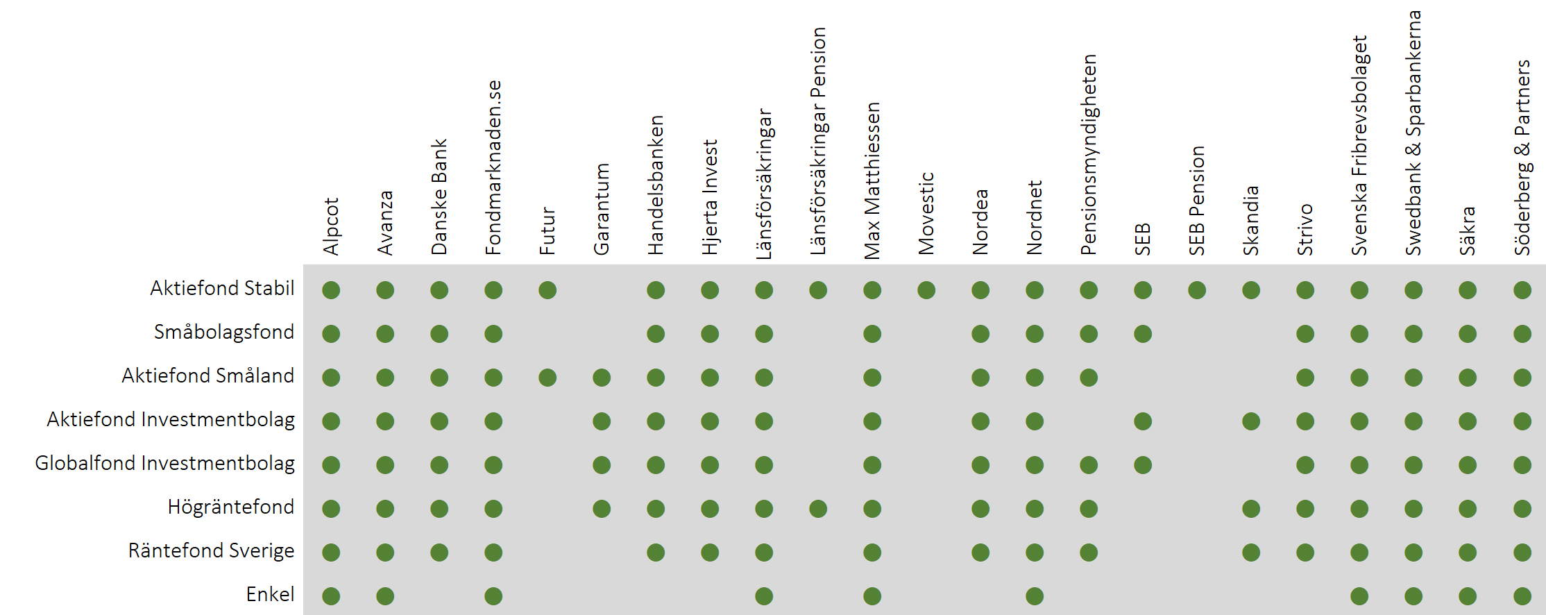 Vi arbetar hårt för att kunna erbjuda våra fonder hos ännu fler samarbetspartners och återförsäljare. Saknas våra fonder där du fondsparar får du gärna höra av dig till dem och framföra ditt önskemål om att få in våra fonder i fondutbudet.