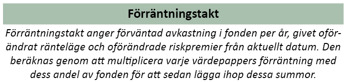 Förräntningstakten är den svenska översättningen av engelskans ”yield to maturity” som anger fondens förväntade avkastning 12 månader framåt efter avgift. Det är dock en teoretisk siffra som bygger på ett oförändrat ränteläge samt framför allt att portföljen ser exakt likadan ut ett år framåt i tiden. Det kommer den inte att göra på grund av att obligationer löper ut, går till förfall, under det kommande året. Det är därför viktigt att komma ihåg att det inte är en utfästelse av en avkastning som man kommer att få om ett år. Förräntningstakt ska mer ses som en indikator på vad obligationerna i fonden ser ut att ge ett år framåt i tiden.