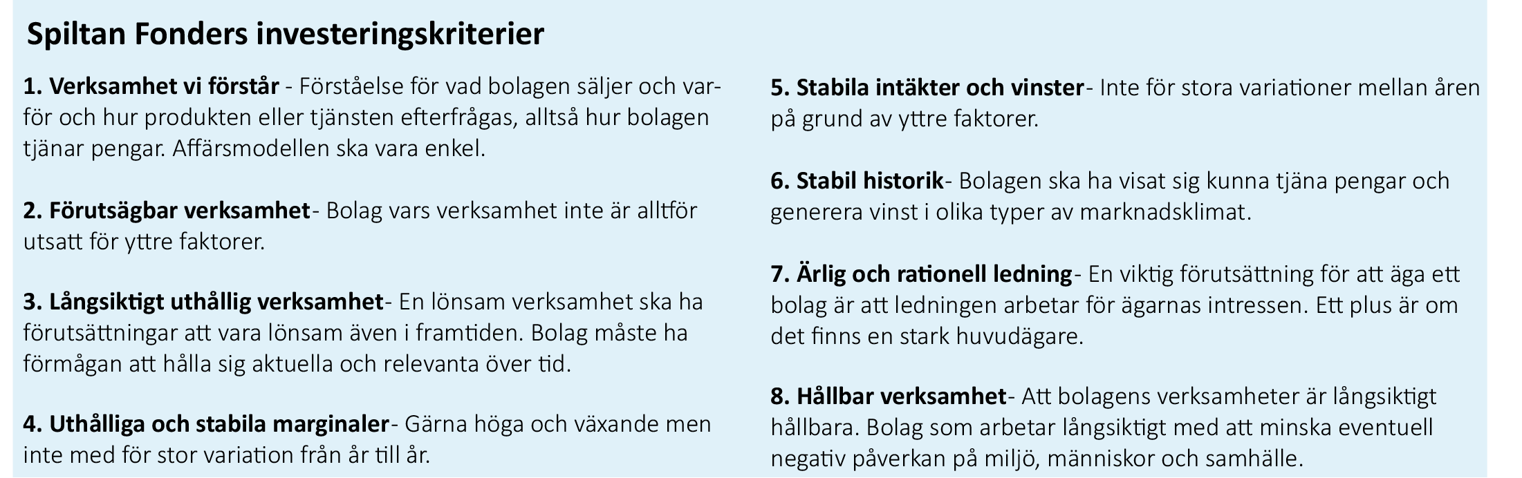Avslutningsvis, när det pratas investeringar är det ofta fullt fokus på att hitta vinnarna men över tid har det visat sig minst lika viktigt att undvika fel bolag. Genom Spiltan Fonders investeringsfilosofi, en tydlig investeringsprocess samt ett ramverk för vilka bolag som är Spiltanbolag, har vi goda förutsättningar att undvika de stora misstagen. Med Spiltanmetoden undviker vi helt enkelt att investera i bolag som är verksamma inom branscher som inte är långsiktigt hållbara och där förutsättningarna är osäkra och oförutsägbara, och investerar istället bara i bolag som uppfyller våra krav, Spiltanbolag.