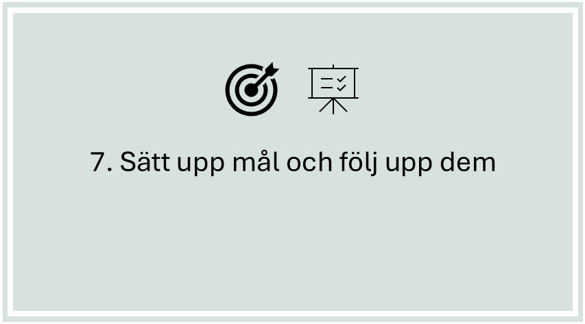 Dela upp målen i delmål och följ upp dem regelbundet, så att du ser att sparandet utvecklas i rätt riktning.